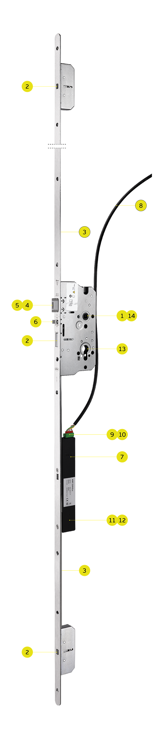 6 - Self-locking with mechanical sequence control (electronically monitored to prevent unwated throwing of the deadbolt) and tampering protection (Mode 2+4)