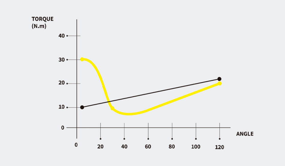 contrário dos sistemas de cremelheira, a evolução entre a força e o ângulo de abertura não é