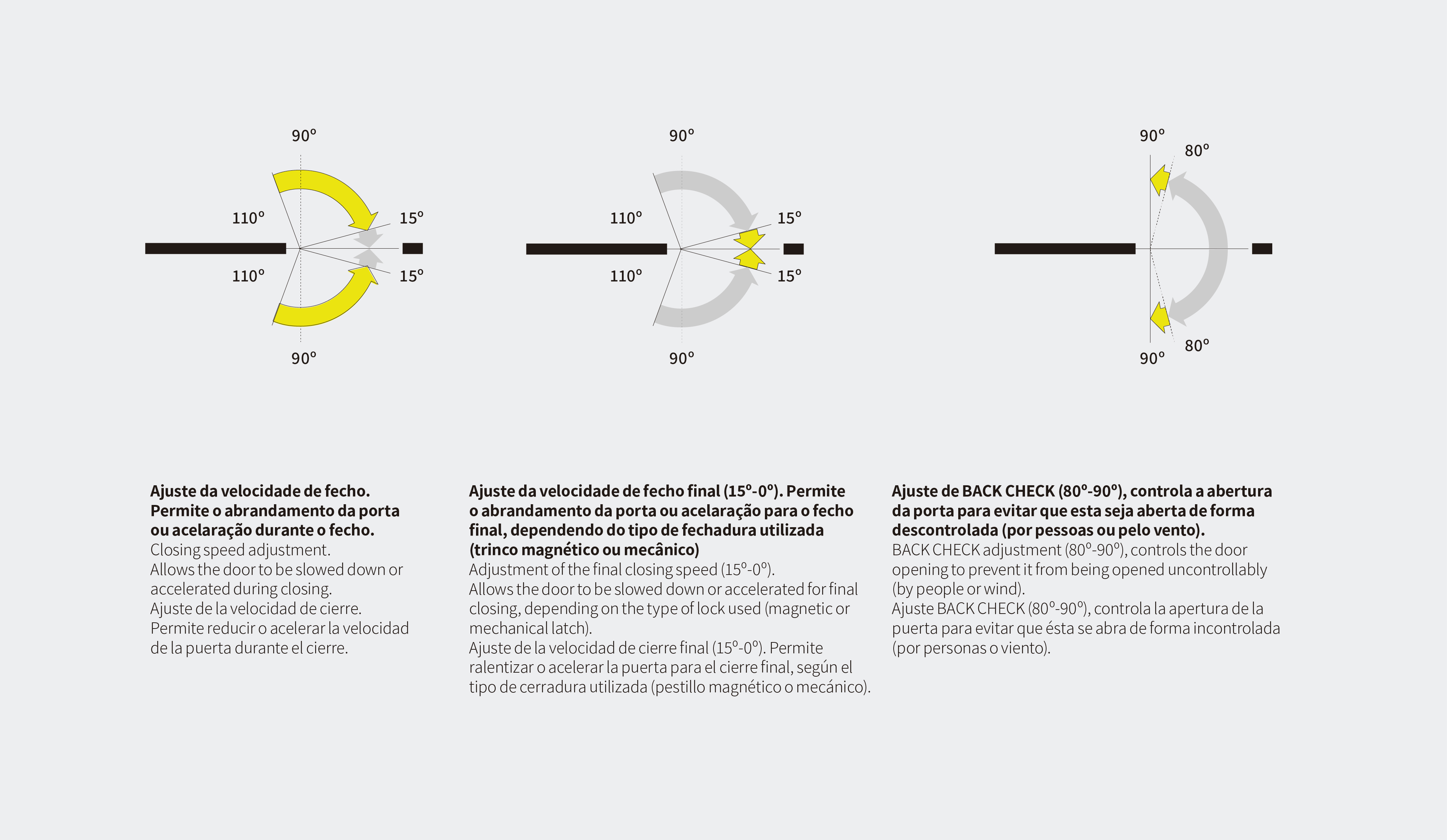 De forma a abranger portas com pesos desde os 40 aos 1000kg, largura até 3000mm e altura até 6000mm, os sistemas possuiem um ajuste de força, o qual pode ser feito com a porta já instalada. Uma das características deste sistema é o ponto de rotação da porta poder ser desde os 150mm até ao centro da porta, sendo a instalação feita pelo topo da porta, o que permite que as portas possam ir até ao tecto.