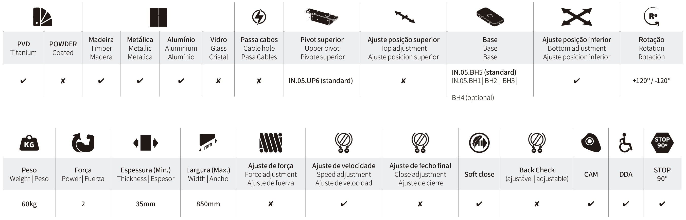 Pode suportar portas até 500 kg, oferecendo soluções hidráulicas e livres adequadas a qualquer tipo de aplicação —portas de madeira, ferro, alumínio, vidro, etc...