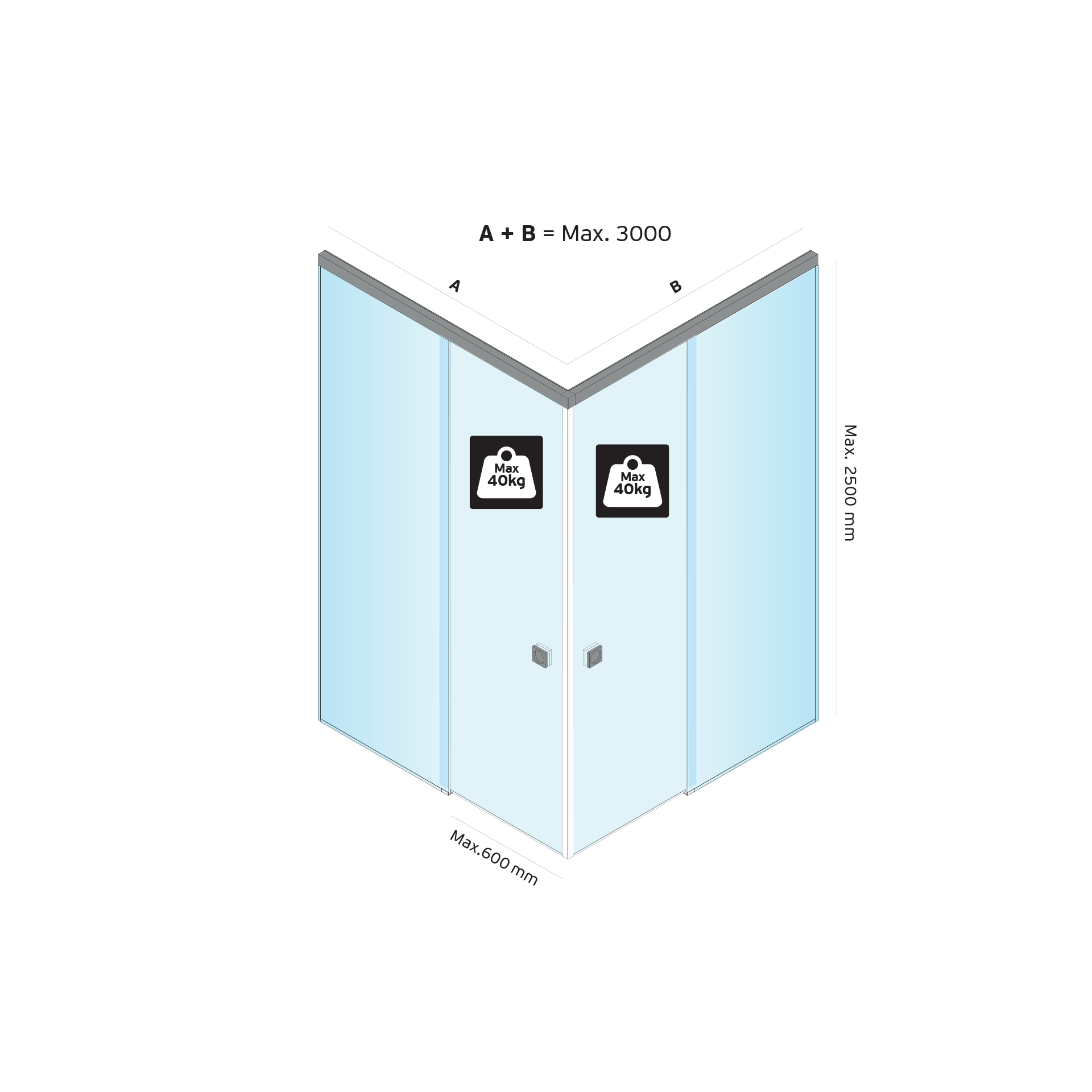 Cabine de chuveiro a 90º com 2 portas de correr com soft closing.