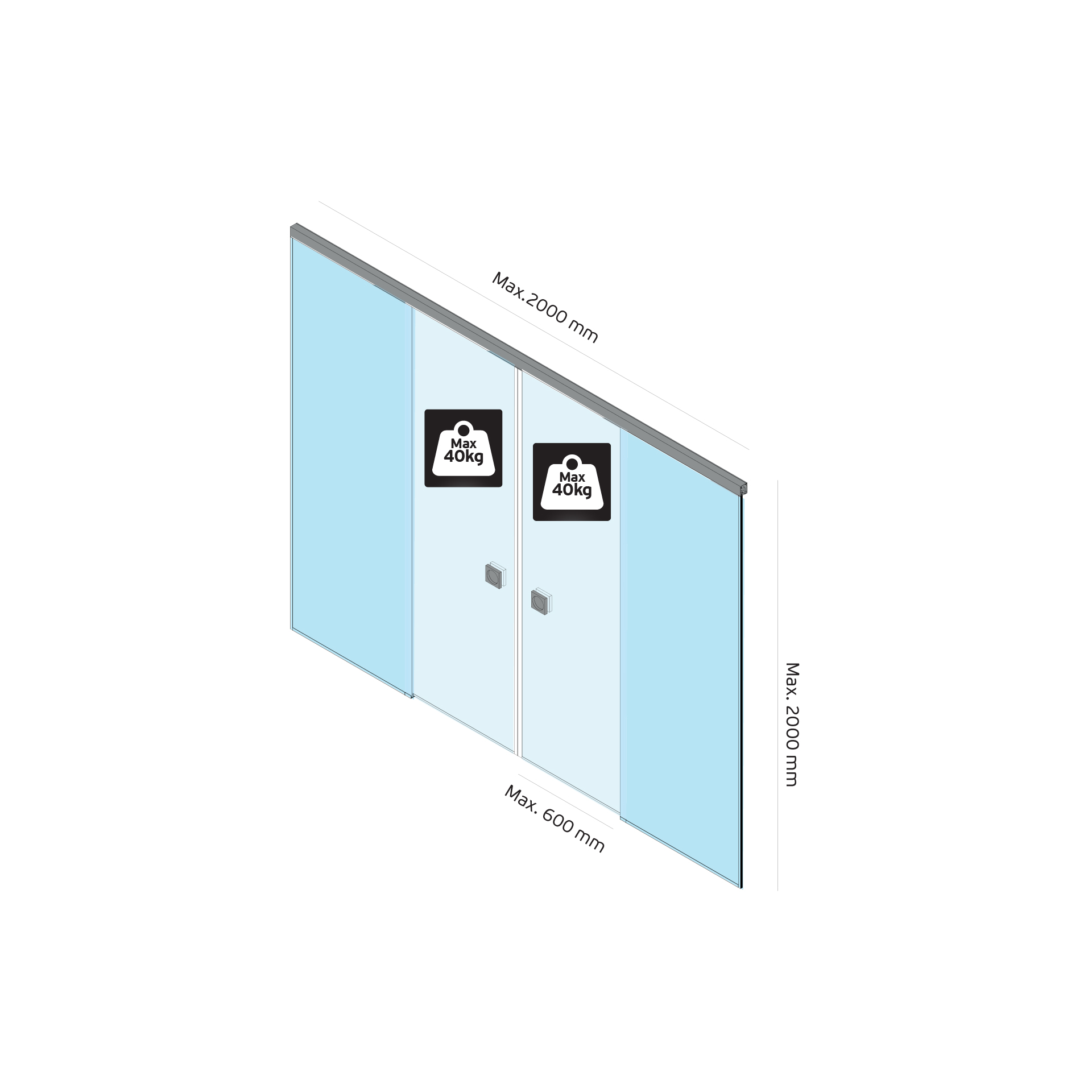 As rodas, são produzidas de nylon reforçado com rolamentos de esferas, correm com baixa fricção sobre o perfil de alumínio anodizado.