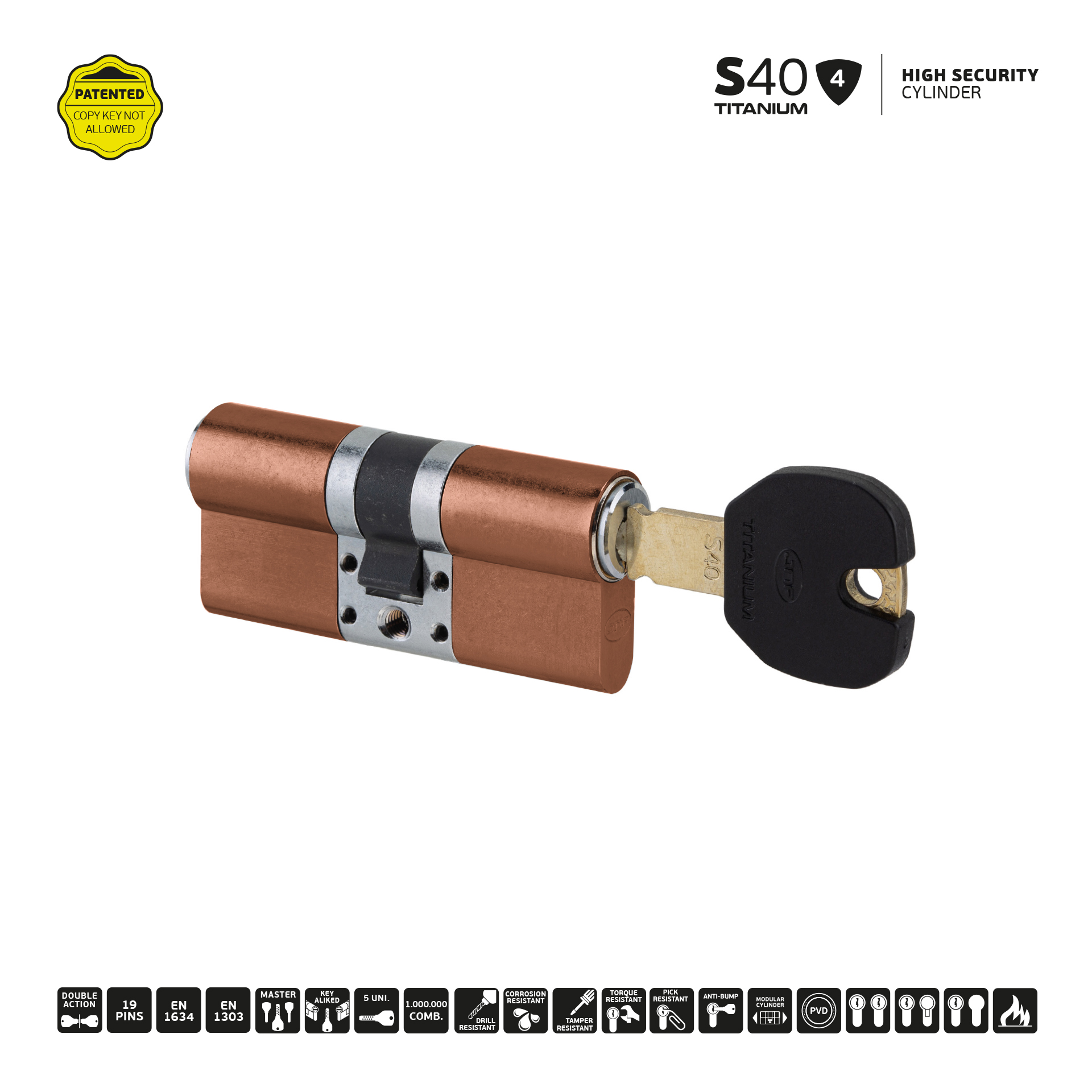 Cilindro de alta segurança IN.19.S40.65.65.TCO PVD Titanium Copper