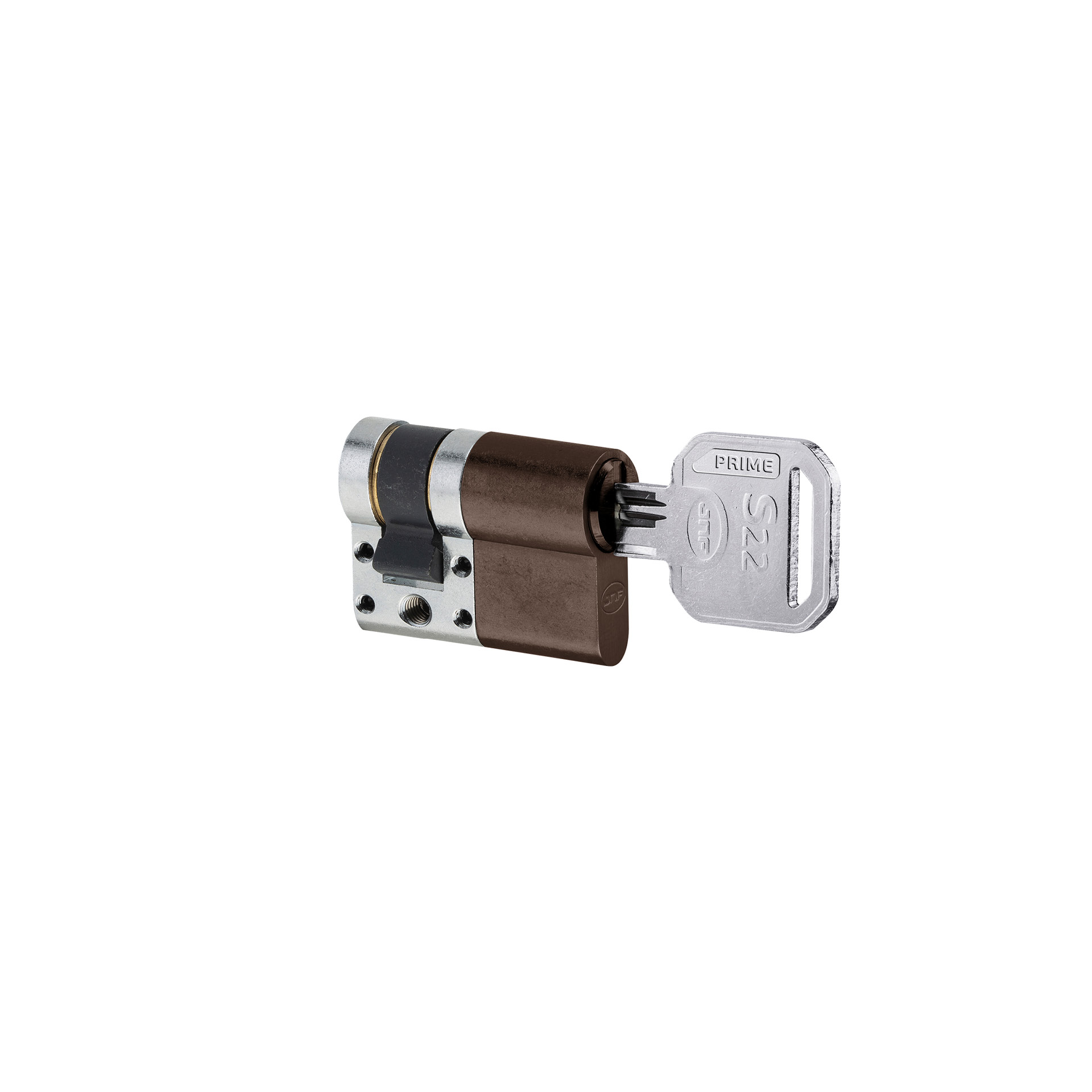 Cilindro de segurança com chave de construção. O cilindro tem como opcional o sistema de dupla ação, que permite abertura pelo exterior mesmo com a chave pelo interior.