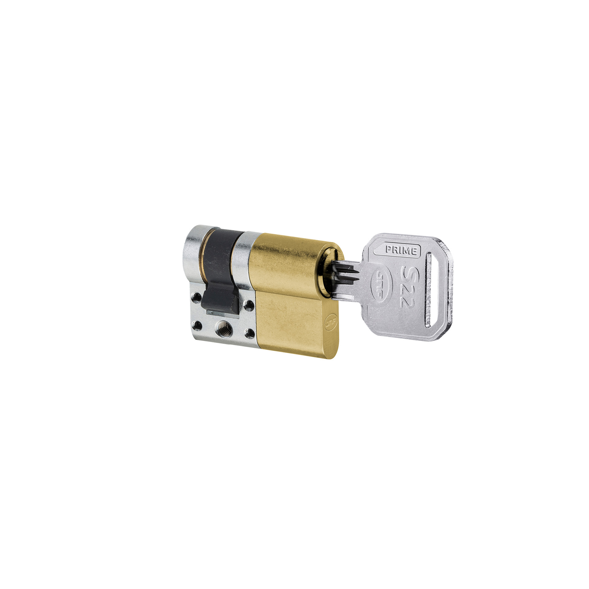 Cilindro de segurança com chave de construção. O cilindro tem como opcional o sistema de dupla ação, que permite abertura pelo exterior mesmo com a chave pelo interior.