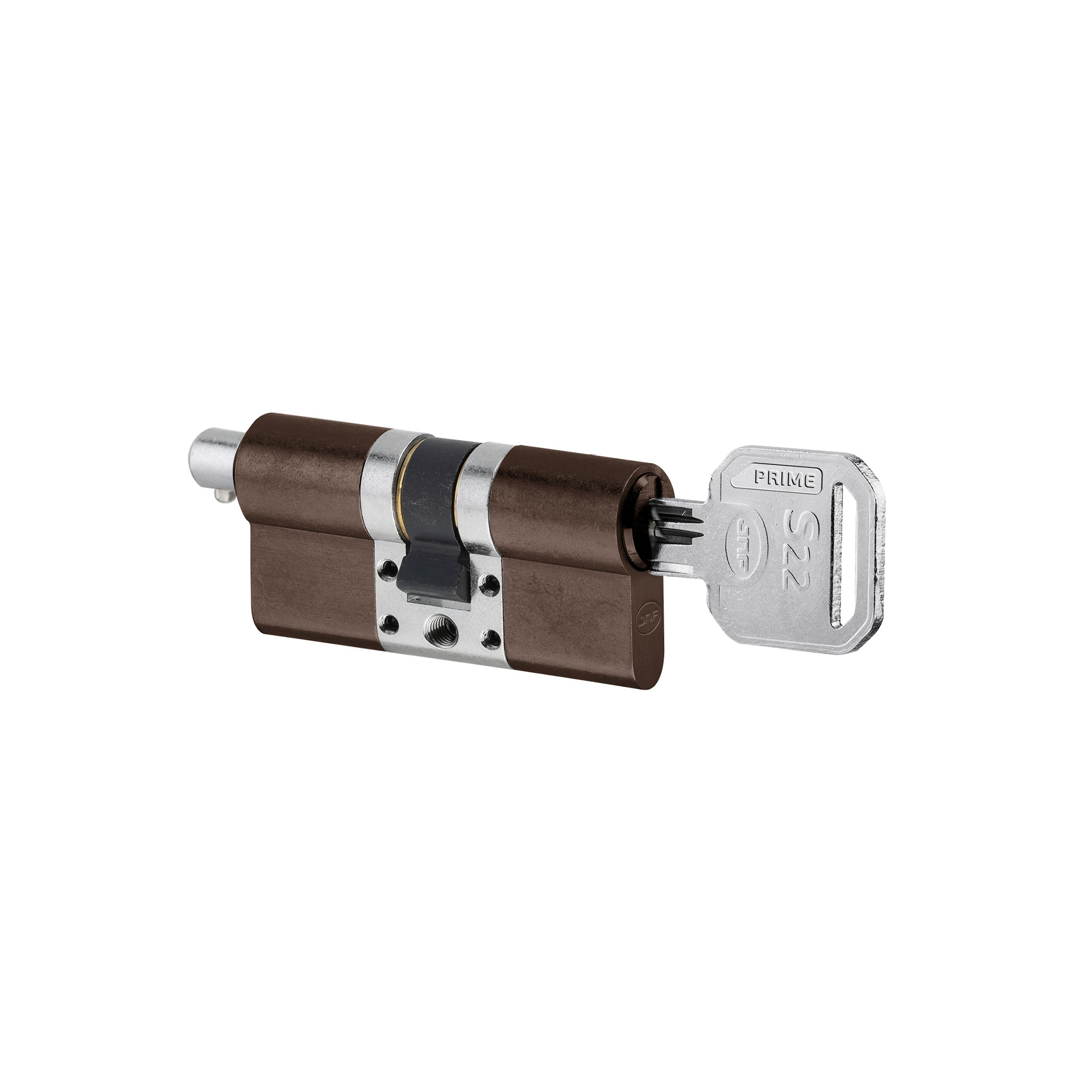 Cilindro de segurança com chave de construção. O cilindro tem como opcional o sistema de dupla ação, que permite abertura pelo exterior mesmo com a chave pelo interior.