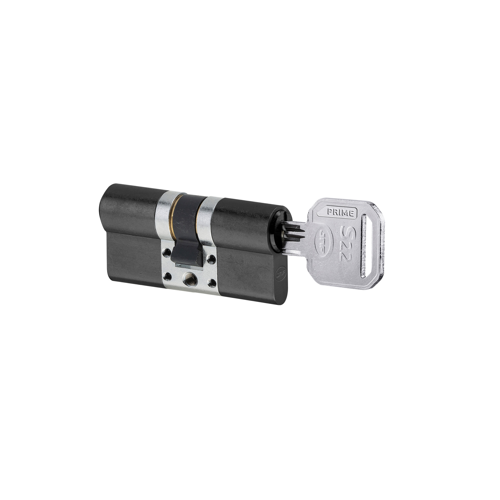 Cilindro de segurança com chave de construção. O cilindro tem como opcional o sistema de dupla ação, que permite abertura pelo exterior mesmo com a chave pelo interior.