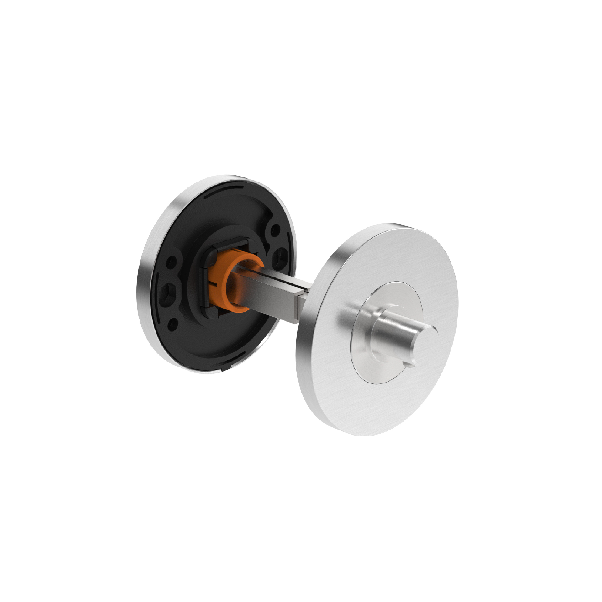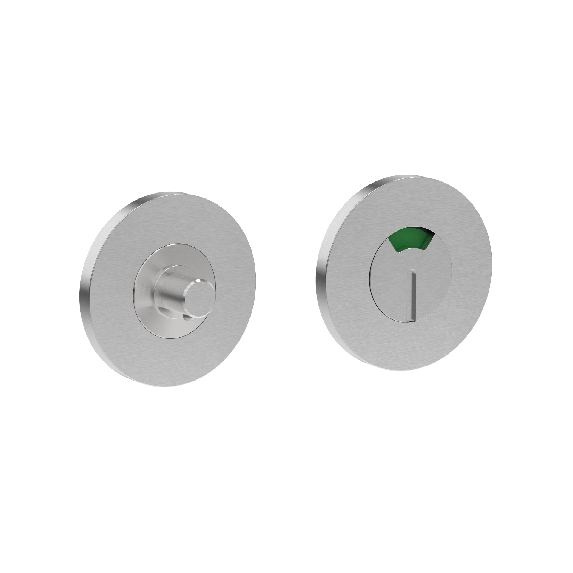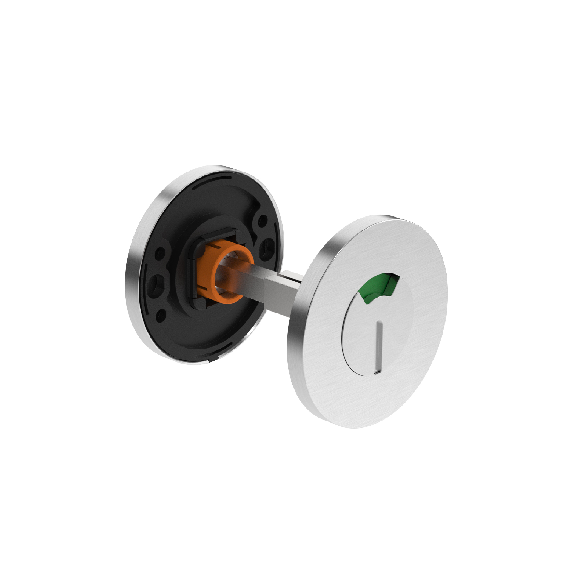 Fecho de casa de banho ergonómico, com indicador de cor, para utilização com fechaduras de embutir. Garante privacidade com possibilidade de abertura de emergência pelo exterior. Botão ergonómico para uma operação confortável, mesmo em espaços reduzidos.
