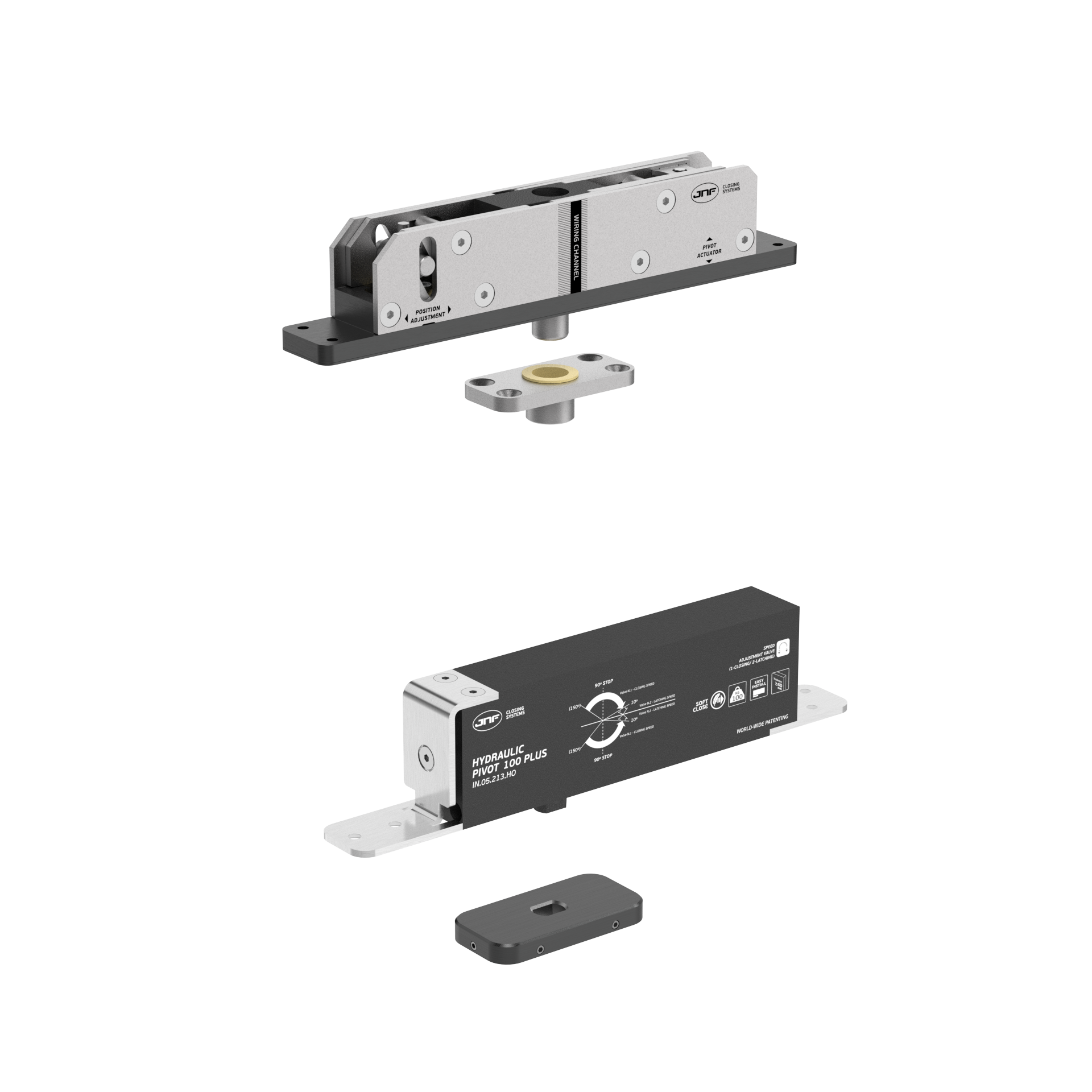 100 PLUS oferece versatilidade total na instalação sem abdicar do desempenho. Projetado para portas até 100kg, este sistema pivotante hidráulico permite ser instalado em qualquer posição ao longo da largura da porta, tornando-o ideal para portas amplas ou com geometrias personalizadas.