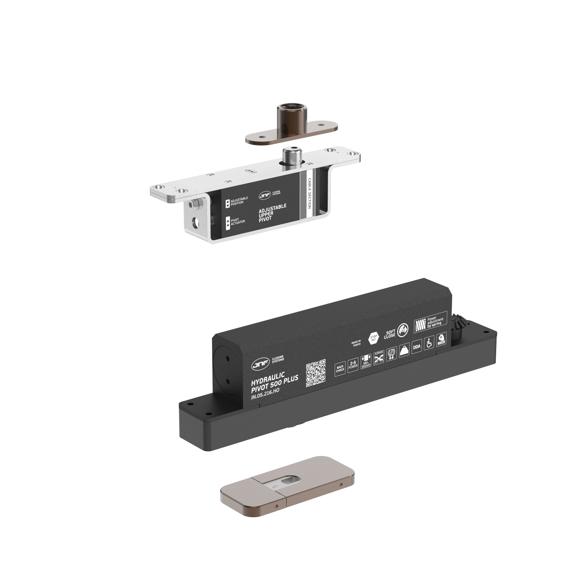 500 PLUS é um sistema pivotante de alta performance, concebido para portas de grandes dimensões com peso até 500kg. Este sistema incorpora uma tecnologia hidráulica com CAM que garante uma abertura extremamente suave e fluída, ideal para portas imponentes em ambientes de elevada exigência estética e funcional.