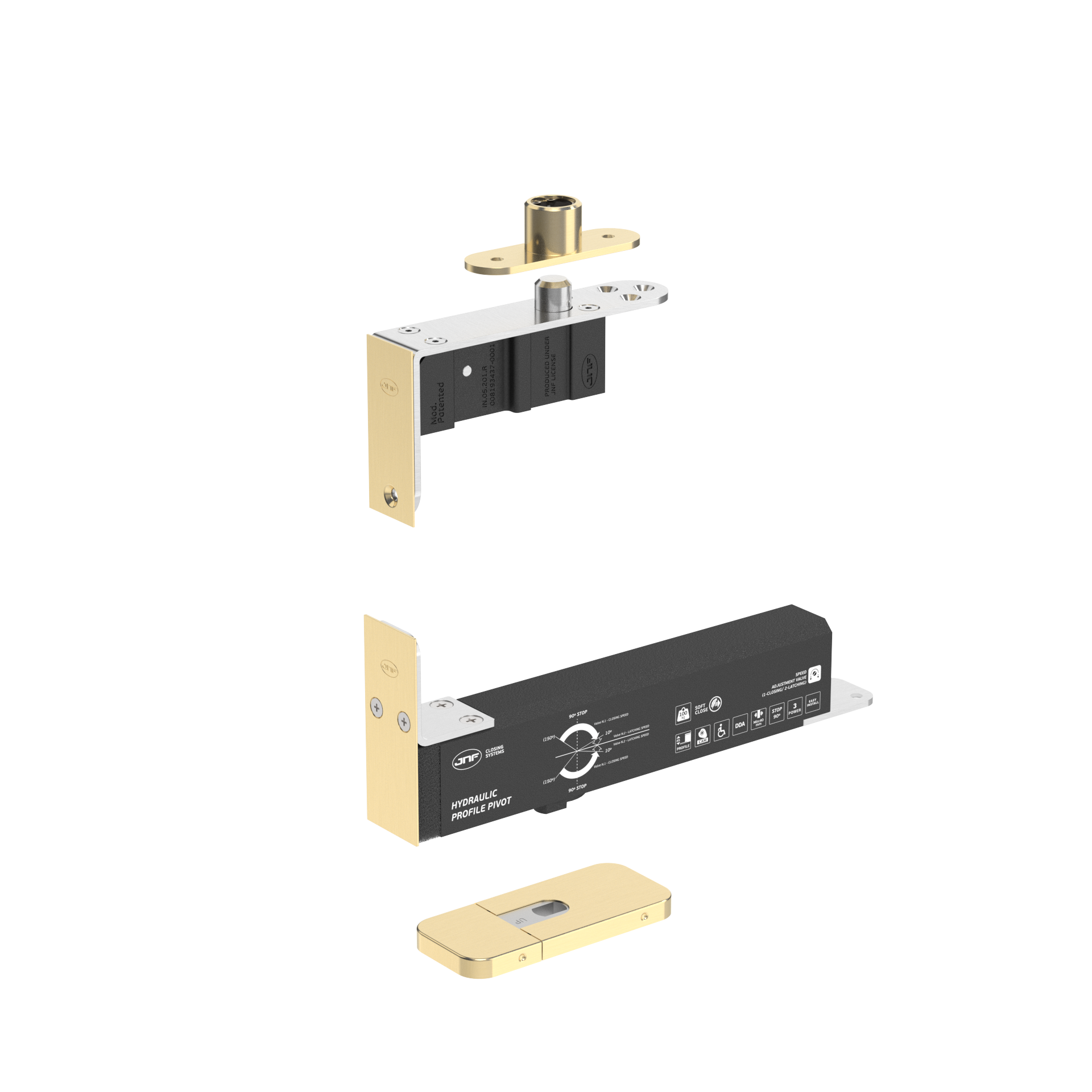 100 EDGE PROFILE é um sistema pivotante hidráulico de instalação lateral (no canto da porta), concebido para portas até 100kg com perfis de alumínio ou aço de baixa secção, como os utilizados em caixilharias minimalistas e soluções técnicas de elevado rigor dimensional.